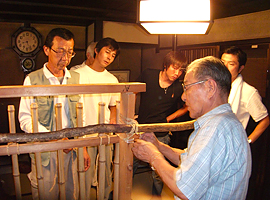 9月5日講義の講義の間に下地窓を編む棟梁 |
