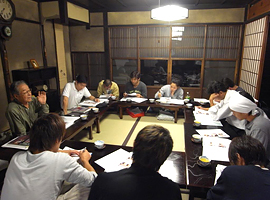 10月6日の座学では荒木塾長より、オリジナルの資料に沿って「職人の心得」、「町家に使われる木材」、「各所の収まり」の講義がありました。すべての項目は技術的に、デザイン的に、また広い意味で無駄を省き、建物を長く手入れできる経済性の点でも統合された内容で、融通無碍に話は広がりました。