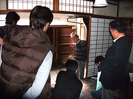 14日の実習では作事組の作庭担当会員の京都景画の木村氏と松浦氏を講師に町家の庭見学に向かいました。秦家では古いものと新しいものが混じりながら、ご家族に慈しまれながら手入れされている庭を見せていただきました。4枚の障子の額縁に切り取られると、同じ庭でまた別の美しさが味わえます。昼食を頂いた矢尾定では、限られたスペースで大小の臼、木賊貼と木賊の対比を活かした庭のつくりを伺いました。吉田家では10年以上かけて材料を集められ、昨年完成したゲンカンニワの供待ちのお話を伺いました。「ニワ」とは居室以外のすべての場所、信仰の表れでもあり、作業の場でもあるそれぞれの庭を吉田先生が町家に戻られてから元に戻し、手入れされてきた顛末をお伺いしました。ナカニワと前栽での陰と陽の使い分け、町家のエンジンルームであるハシリニワの紹介、季節で変わる庭の楽しみと、変わらない景色を守る部分など、見学のごとに別の見地からのお話をいただけます。最後には作事組の新事務局も置かれている釜座町町家を訪ねました。盛況のオープンハウスの中、元からのモチノキを中心に新しくしつらえられた庭のお話を伺いました。取り壊された他の町家から移された瓦や敷石が新しい庭の一部になっていく様では町家の歴史が将来につながります。