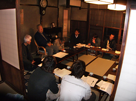 17日の座学では作事組の顧問でもあり京都林泉協会の佐藤会長から庭の歴史の講義をいただきました。上古より信仰と結びつく日本の庭が、歴史の中で宗教の変遷とともに重層的に作り上げられていく過程を、多くの実例を交えながらお話いただきました。いつもながら明治の町家の庭まで到底たどり着きませんが、日本の庭の世界に底知れぬ奥行きがあることを教わります。自然の景を方寸の世界に取り込み再現する庭が今日の住宅の無国籍の庭と違うことを教わります。