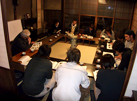 1 5 日の座学では京町家の構造について末川より話をしました。この5 年間の現場の実務で考え得ること、棟梁塾で荒木塾長から聞き及んだことなどを再構成して話しました。町家の構造について、疑問があればこれからも正面から考えること、意見交換を求めました。