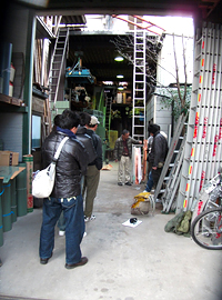 1 2 日は板金の実習で、作事組板金担当橋爪親方の講義です。無駄のない材料の割付寸法、工場で出来る加工と現場でしなければならない加工の使い分け、それにともなう道具の使い分け、ハマグリの谷など特殊な役物のむつかしさと職人による手間の違い、下地材つくりの手間と工業製品での単価のこと、流れの向きに応じたルーフィングのタッカーの向きやピッチ、樋の径を決める雨量計算方法、樋の雨仕舞と今日的なデザインの流行との問題、屋根の仕上げ材の改修の際に樋の高さを同時に考える必要、京アンコウの作り方とそのヴァリエーション、それぞれの屋根の形状に応じて、無駄なく手入れしやすく納める方法を現場で判断する基準について話されました。あわせて恒例のご近所の浄福寺通りの屋根や樋の施工例を見学して廻りました。3 回目となっても、また新しい見地から話をお聞かせいただきました。前期の塾生が楽しんだ板金の作品つくりは次回機会に持ちこされ ます。兵庫の龍野で伝統建築の再生に取り組まれる長坂氏の見学もありました。