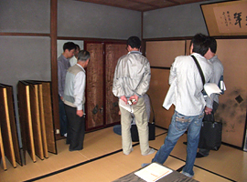 5日の実習では楊梅通りの遠藤邸の見学に伺いました。明治38年に完成した表屋造りの規模の大きい町家です。10年間に渡って準備された普請の覚え書きと、プラン検討の過程、すべての拾い出しと見積もり、現場での変更箇所とその清算書、職人の出面帳が残されています。カラス口で描かれた矩計や床の間書院のアクソメも見られ、プランに中廊下やダムウェターの導入があり、近代建築設計の修練者が参画した跡も見られます。ハシリと風呂以外に近代的な改修は無く、記録と建物がそのまま貴重に残る町家です。築造時の棟梁の孫弟子にあたる大工が晩年までお手入れを続けてこられ、近年まで町家のお出入りが正統に守られてきた町家でもあります。2階に間口3間の12.5畳の間があり、1階の間取で芯ずれが処理され、この座敷の実現が町家新築の最大の目標であったことがわかります。構造材の柱は桧、造作材のほとんどは栂、座敷の壁は築造時からの九条土が残ります。欄間や書院では形式的な装飾は省かれ、材料と仕事の値打ちが大切に造られた町家であることがわかります。町家が大切に残されることとあわせて、普請文書はまだまだ読み解ける興味深い内容も多いと思われます。