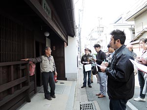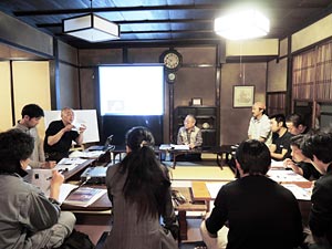 4月3日に入塾式が行われ、荒木塾長と末川塾頭から町家に携わる心構えと激励の言葉がありました。京町家再生研究会の小島理事長と京町家情報センターの松井理事長もお越しくださり、将来町家を担っていく塾生達に期待を寄せられたほか、1〜3期の卒業生数名も駆けつけました。入塾式の後にはさっそく座学が始まり、京町家の歴史について、作事組の梶山理事長から授業がありました。 14日には町家見学実習を行い、4軒の町家を訪問しました。小島家と長江家ではご当主自ら、家の歴史や造りについてのお話を聞かせてくださいました。いずれの町家でも荒木塾長から解説があり、次から次へと繰り出される貴重な話に、塾生達は一言も聞き逃すまいと熱心にメモを取っていました。 17日の座学の授業では、京町家の造りについて、末川塾頭から講義がありました。少し高度な内容で付いていくのが難しかったかもしれませんが、一度で完全に理解できなくても、全ての授業が終わる頃には用語にも聞き馴染み、自分のものになっていることでしょう。京町家の構造については来年にまた詳しい授業が持たれる予定です。 4期生はとても真面目な印象ですが、果たしてどんな変化を見せてくれるのでしょうか、今後の授業が楽しみです。 (事務局 常吉裕子)