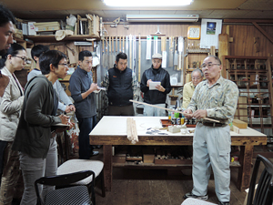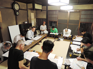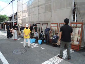 建具の講義では材の種類、選び方から多彩な仕口、今でも機械を使わず手作業で行わなければならない箇所の説明等、かなりハードルの高い内容であった。建具職人の親方曰く「建具は100年持つ物」とのこと。塾長以外にどれだけ把握出来た者が居たのか、塾生のレポートを見ることにしよう。この実習には小田原から市役所の方を含め三名が棟梁塾の見学に来られた。地元の景観を残すため、再生研や作事組が行っている組織の運営や職人の育成方法など、熱心に質問された。 日は替わり、洗いの実習である。塾長の現場を御借りして、お施主さん参加で行われた。木目に沿って手際良く作業が進む。道具が多くいるわけでは無い分、感覚がものをいう。アク洗いされた古建具がほどよい飴色に甦った時「昔は皆、物を大切にしたものだ」とおっしゃった塾長の声と建具の親方が言われた「100年持つ物を作らないといけない」という言葉が重なって聞こえた気がした。 今月唯一の座学は、京都市独自の条例ならびに補助金制度について景観政策課の浅田係長、建築安全推進課の佐藤係長に説明して頂いた。着目すべきは伝統工法独自の改修に補助金が付いた事だろう(根継・土壁・礎石の据え直し等)。行政がここまで踏込んだ事はプラスではなかろうか、それだけ住民の声が高まっている証拠である。喜んでばかりもいられない注意すべき点もある、基準を決める側である。町家を理解しているとは思えぬ項目がちらほらある、もう少し現場の声を聞くべきではなかろうか(口ではなく手を動かしている職人に)。幾度もの天災から復興され今も受け継がれる伝統木造も人災には勝てぬのである。その為にも我々現場からもっと声を上げるべきである、住民の思いは届いているのだから。 (施工担当理事 辻勇治)