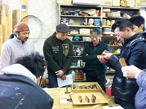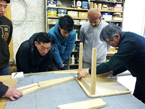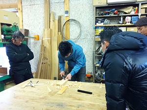 座学では、和洋家具の比較や木材の種類と特性、制作工程を初め、漆の歴史、産地に採取方法、漆工法まで幅広く学びました。漆を扱う為の道具には人毛・馬毛・クジラのヒゲ・鯛の牙・鹿の角の粉・イカの甲羅・鶴の羽の軸…等々があると教わり、自然の物を上手く使ってきた先人たちの知恵に驚かされます。 実習では、笠取の工房にて塗師屋体験をさせて頂きました。各自漆を塗りたい素材を持参し、講習を受け、拭漆という技法に挑みます。触れるとかぶれる漆に、皆冷や汗ものです。室での乾きを楽しみに待ちます。工房には建田講師の作品も多数あり、仕上がり目前の椅子の組み立て方についても学びました。仕口や組順だけでなく、実際に組み上った椅子に座らせて頂き、その座りやすさに感激!工業製品の椅子とはわけが違います。「お客さんに気に入られなかったら、ただの粗大ゴミでしかない。」そんな心意気の込められた家具に、用と美を兼ね備えた洗練を感じました。 制作するに当たって心に留めるべきことがらとして読み上げて頂いた、柳宗悦「工人銘」その一文に、 一、よき師をもち よき友をもつべし 一つは高きに昇らん為也 一つは近きに温まらん為也 孤獨はよろしからず とありました。これぞ棟梁塾。 (施工担当理事 大下尚平)