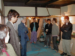 Nm邸では現場の左官工事を担当した萩野氏と電気工事を担当した堀氏を講師として実地での基本的な知識や仕事の流れ、他の職種との段取りや取り合いの要点、京町家に即した工事の難しさについて話を聞きました。各塾生からも経験に基づいた疑問や共有したい工夫が積極的に述べられました。