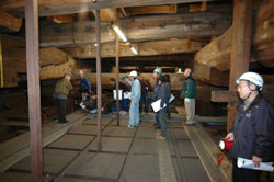 日本最大の木造建築である東本願寺御影堂の小屋裏の見学会が行われました。禁門の変で焼け、明治8年に再建され、国の文化財ではないものの、大規模寺院や文化財に大々的に金物が使われる直前の再建であり、その点にも見学の価値がありました。斜め上束と書かれたトラス材や、構造でなく意匠となった斗拱が見られ、過渡の時代を物語っていました。陸までの軸組みはヤトイ中心で、柱の断面欠損を押さえ、横架材の材料を有効に使いながら、地震に対しては仕口の初期の耐力には期待せず、大きい変形性能なかでゆっくり減衰する構えです。松とケヤキの混じる小屋組みの横架材の両端の台持ちには、拳骨が入るまでの暴れもありますが、塾長いわく、今この程度であれば、出来たときには完全に合っていただろうということです。隅木の下の二重三重の腕木の持ち出しは、図面管理は不能の世界で、そのボリュームにも圧倒されました。内部の見学の後、塾長により、基本的な堂宮の構成についての講義があり、各部の象徴する意味については理事長からも話がありました。