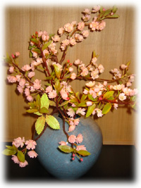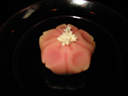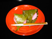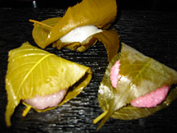 京都では、桜餅には道明寺粉(どうみょうじこ)を用います。道明寺粉とは、もち米を水につけて洗い乾燥させたもので、大阪・河内の道明寺のお供え米のお下がりから始まったものといわれています。蒸した道明寺粉でこし餡を包んで丸めますが、道明寺粉は白いままだったり、食紅をほんの少量使って薄紅色にしたり、ちょっと濃いめのピンクだったり。桜の葉も一枚でくるんだり、二枚使ってはさんだり、お店によって異なります。 葉っぱは食べようか?残そうか?迷うところですが、これはどちらでも良いようです。お茶席では、包んである桜の葉を折り返して桜餅の下に敷き込み、黒文字を使っていただくことが多いようです。黒文字を使うと、葉っぱもいっしょに切り分けるのは難しいので、最初から葉をのけていただくことになってしまうのです。葉が柔らかい場合は、くるまれたままの形でお餅といっしょに食べればよいのですが、残った葉や軸は、懐紙に包んで持ち帰ります。一般の家庭でいただく場合は、黒文字などは使わずに、手に持って直接口へ運ぶのが常でしょう。食べ口を他の人に見せないようにしていただけば、そんなにお行儀の悪いものではないかと思います。 ほかにも、桜にちなんだ生菓子はたくさんありますが、どれも淡い桜色が美しく、優しい形をしています。