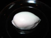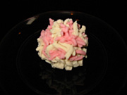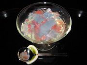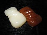 ・新粉餅(しんこもち) 上新粉を材料とするところから「しんこ」と呼ばれるようですが、「ひねりもち」ともいっています。もとは、江戸時代の旧暦六月十六日に幕府が行なう吉祥祝い(災いを除け福を招く伝統の行事)のときに用いられた「寄り水」というL字型にねじった黄色と白色の「しんこもち」であるといわれています。そのねじった形が糸のかせに似ているところから、京都では「白糸もち」と呼ばれていた時代もあるようですが、今では「寄り水」という名も「白糸もち」という名も残っていません。現在「しんこ=ひねりもち」は、白色のものと、ニッキを使った茶色、お店によっては抹茶の緑色のものがあります。 |