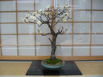 * 梅は、園芸上いくつかに分類・統合されていて、これは、最も原種に近い野梅(やばい)です。 花は小輪で香りが強く、盆栽に作られる花梅の代表的なものです。 * 例年は1月下旬か2月初旬から開花するのですが、年末に蕾が膨らみはじめたので、 今年は元旦早々から、ウィンドウに出ています。 * この木は、元は東京・本郷のマンションのゴミ置き場に捨ててあったものです。 その時は花も葉もなく、鉢から抜かれて、一見枯れ木に見えましたが、 根はついていて、生きていることはわかりました。 * この梅の元の持ち主は、引越しをされたか、 あるいはお亡くなりになってお世話をする方がいなくなったのだろうと思います。 今も京都で馥郁たる香りを漂わせていると知れば、さぞ驚かれることでしょう。 * 満開を過ぎると、花びらがどんどん落ちてきます。 残念ながら、この梅は、このサイトに載る日に家の中の庭へと移しています。 * さて、次に何が出てきますかお楽しみに。