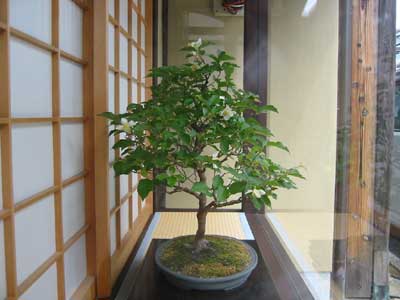 沙羅の木は、夏ツバキとも言います。 姫沙羅は、その小型版です。 * 先の「町家のウィンドウ」で見ていただいたように、 冬場は、樹形と冬芽を楽しみますが、 初夏には、緑の葉に映える白い花を楽しみます。 * その花は一日花で、朝に咲いて、夕方には散ります。 散るというより、ツバキと同じで、花がボトンと落ちるのです。 * 京都市右京区花園の妙心寺塔頭・東林院には、 樹齢300年といわれる沙羅の古木があって、 この時季、「沙羅の花を愛でる会」が開かれています。 * 最初に書いたように、 姫沙羅は、沙羅の小型版ですから、 その花もひとまわり小さく、直径は3〜4cmほどです。 * いつもと写真のアングルが違うのは、 正面からだと、咲いている花が見えにくかったからです。 * ちなみに、この木は、1月末〜2月に載せた、枝だけの「姫沙羅」と同じ木です。 * さて、次は何が出てきますかお楽しみに。