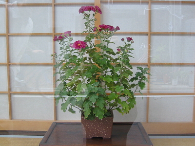 夏のあいだ、 東向きのウィンドウは、日差しもきつく、風通しも悪くて、 植物を置くには適していませんでしたので、 「町家のウィンドウ」も開店休業状態でした。 * 秋になって、 花としては珍しくもない菊ですが、 先日「何の花ですか?」と聞く人がいて、 驚いてしまいました。 * これは、数年前、信州に住む親戚が 庭の柿の実を送ってきてくれたダンボールの箱の中に 何故か一緒に入っていた苗を育てたものです。 * 菊は多年草ですので、 毎年放っておいても花は咲きますが また翌年同じような形で咲くと思ったら大間違いです。 * 5月頃に芽をつまんで、挿し木をし、 それを育てていくことで、 枝ぶりや花の高さを一定に保ち、 思うような形にすることができるのです。 * この時季、見事な形の懸崖(けんがい)仕立てや、 菊人形に使われている菊の花は、 育てている人の苦労たるや大変なものなのです。 * ちなみに、この鉢は、表面が梨地(なしぢ)模様になっています。 この季節に飾るには面白いかと思っています。 * さて、次は何が出てきますかお楽しみに。