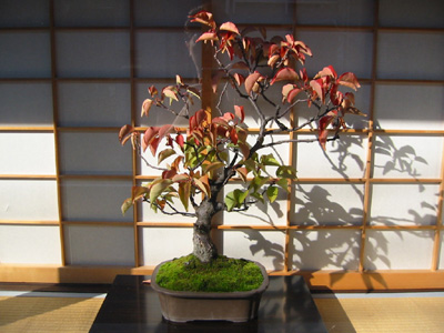 春の開花時に載せたものと同じ木です。 紅葉してきたので、ウィンドウに飾ってみました。 * 下部の葉がまだ一部緑色をしているのが、 かえって紅葉を美しく見せています。 * また、鉢上の苔の色との対比で、 葉の紅色を一層鮮やかに感じます。 * 東京のマンションのベランダで育てていた時は、 この杏の木が紅葉した覚えは特にありません。 * 京都の家の屋根上の盆栽棚は、 とても日当たりが良いので、 こんな紅葉が見られるようになったのでしょう。 * 夏の間の日照が強すぎると、 モミジなどは葉が焼けてしまうことがあるのですが、 杏の葉は、モミジなどに比べて少々厚いためか、 葉を痛めずにすんでいるのかもしれません。 * さて、次は何が出てきますかお楽しみに。
