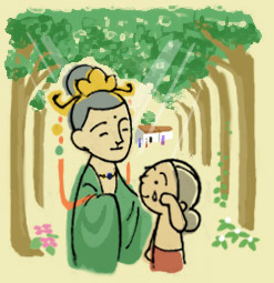 「滅相(めっそう)な。何おっしゃっとくれやす。気にせんといてや。そやけど、よー言(ゆ)わはった、善財はん。その、偉らい人(しと)になって、世の為に成るてゆー気を忘れんとくない。さあ、普賢菩薩(ふげんぼさつ)はんてゆーお方(かた)にお引き合わせしとおす。ほんま言(ゆ)ーたら、あんさん千度(せんど)、お待ちやったんどすえ。」