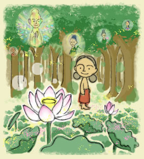 善財(ぜんざい)わ、千度(せんど)お礼を言(ゆ)ーと、なんやほっこりして、久しぶりにガヤの林を歩いた。サラの木(きー)わサワサワ風にそよぎ、奥深(おくぶか)い池にさしかかると、蓮(はす)の花の上にわ、やっぱし仏(ほとけ)さんわ居(い)やはらへなんだ。けど蓮(はす)の花わ、ものすご生(い)きいきしててきれーやった。池も林も空も、見れば見るほど、前に見たことあらへんほど、きれーやった。ほんで、善財の心の中まで、なんや、はんなりした気(きー)になってきた。