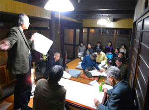 プロジェクトチーム第1回会合 4月17日に開催された平成22年度総会での話し合いを受け、4月23日(土)午後7時から長谷川絵雅堂にてプロジェクトチームの第1回の会合が開催されました。 会合には、店子に予定され、また、改修を担当頂くことになる京町家作事組から梶山氏(理事長)、荒木氏(副理事長)、木下氏(設計担当)、大下氏(施工担当)、内田氏(事務局)にご参加いただき、プロジェクトチームからは、吉田、森村、井上、長谷川が参加しました。まず、作事組から御提案いただいた改修内容と工事費などについてご説明いただきました。建物の使いかたとしては、作事組の事務局として、また、町家再生の拠点として使われる予定とのことですが、釜座町がこれまで通り地蔵盆、役員会、総会などで使用出来ることを確認しました。今後の検討課題として、工事費の一部には財団からの助成金が充てられますが、残りの工事費の負担の方法など税金等も含めて検討が必要であること、また、改修内容や工事費等の再度の検討を行うことなどがあります。 財団からの助成金の予定から、6月頃には改修工事を始め、10月頃には完了するタイムスケジュールを設定し、そのためには早急に詳細を詰めて行く必要があります。釜座町の町家が無事再生し活用されることを目ざし、町内の皆様からのご意見を集約しつつ、プロジェクトチームがリードしながら事業をすすめていく予定です。ご協力のほど、よろしくお願い申し上げます。