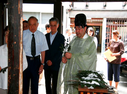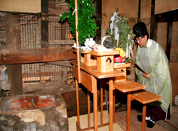 ![]() 古井戸のお清めの御祓いをしました。 6月30日(水)11時より、今回の修復で埋め立てることになった井戸のお清めの御祓いを行いました。 御祓いには近くの高松神明神社の村上宮司様に来て頂き、釜座町から、森村夫妻、中塚、田中、沢田、杉本、岸本、長谷川の8名とまちセンの西井さん、作事組の木下さん、大下棟梁、井上カメラマンなどが参拝し、工事の無事安全を祈願しました。 7月6日(火)町家の前の部分が取り壊されていている今なら、町家の奥にある倉庫を解体せずに出せるということで、大下工務店の9人の大工さんにお願いして明倫自治会館まで運んでいただきました。釜座町からの寄贈として今後は明倫自主防災会の器具庫として活用される事になりました。