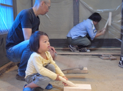 ![]() いよいよ町家再生プロジェクトも 大詰めを迎えました。 10月23日(土)の三和土の体験会には、釜座町の将来を担う子供たちと私達中間世代、お年寄り世代、SDCの学生達、作事組の関係者等など大勢の人々が土を叩いて土間作りを体験しました。 叩いている時はストレス解消に最適と、思い切り叩きました。翌日手がどうなることかと思いましたが、叩くのが少なかったのか思ったほどは手に来ませんでした。立派な土間に仕上がりましたので安心しています。
